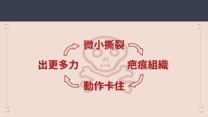 「微小撕裂 → 疤痕組織 → 動作卡住 → 出更多的力氣 → 產生更多微小撕裂」的惡性循環。