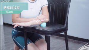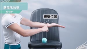 拿一張椅子,把球放在椅子上,把前臂翻過來,,把手壓在按摩球上。
